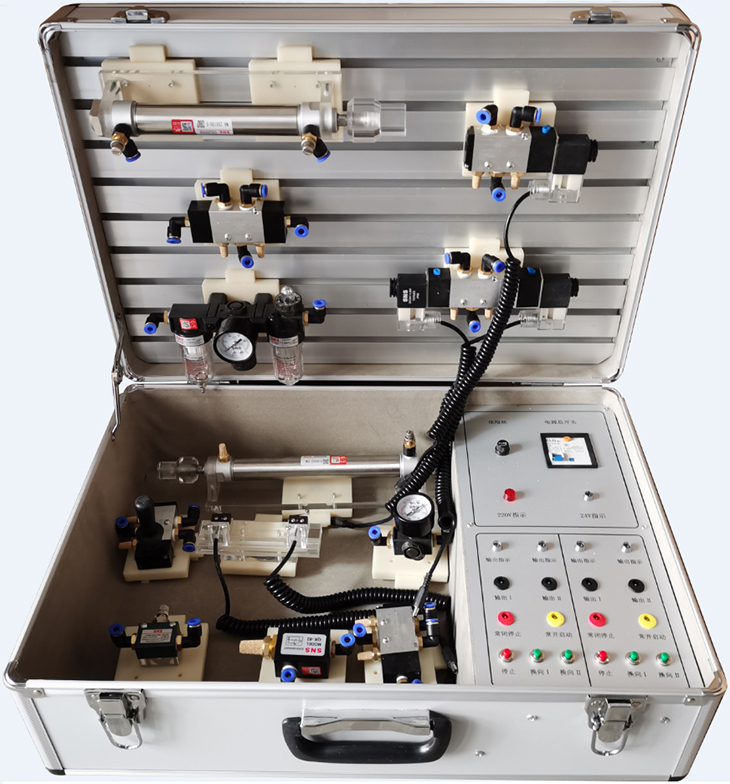 1、實訓(xùn)箱主要由鋁合金機箱、各種標(biāo)準(zhǔn)氣動工業(yè)元件、和電氣控制器件等組成。