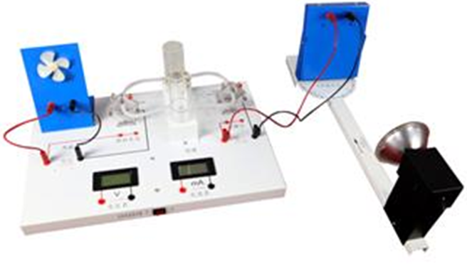 燃料電池教具是利用光線照射在太陽能電池板上產(chǎn)生電能,然后利用產(chǎn)生的電能作用在電解電池模塊上,使水發(fā)生電解產(chǎn)生氫氣和氧氣。氫氣和氧氣進(jìn)入到發(fā)電模塊產(chǎn)生電能,帶動(dòng)風(fēng)扇轉(zhuǎn)動(dòng)。