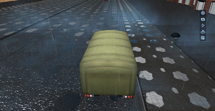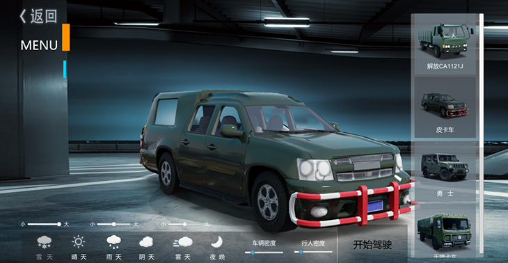 7.6、場(chǎng)景天氣類型具有:晴天、陰天、雨天、雪天、霧天、夜晚等模塊,不同天氣有不同場(chǎng)景效果,同時(shí)路面有不同的屬性。道路上的行人密度、車輛密度可調(diào)節(jié).