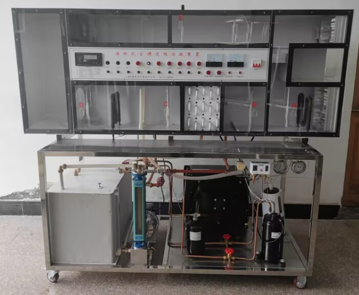 空氣熱濕處理實(shí)驗(yàn)裝置為《空氣調(diào)節(jié)》課程實(shí)驗(yàn)教學(xué)設(shè)備,用它可以模擬不同季節(jié)室內(nèi)和室外的環(huán)境和空氣處理調(diào)節(jié)的方法,進(jìn) 行集中式空調(diào)系統(tǒng)不同循環(huán)形式的空氣調(diào)節(jié)實(shí)驗(yàn)。還可以 做變風(fēng)量運(yùn)行調(diào)節(jié)實(shí)驗(yàn)和制冷系統(tǒng)的參數(shù)測定及其調(diào)節(jié)實(shí)驗(yàn)。裝置具有透明風(fēng)管,可直觀地觀察和測試。實(shí)驗(yàn)裝置的 結(jié)構(gòu)由空氣循環(huán)系統(tǒng)、加濕器、加熱器、冷卻器及其冷水 機(jī)組和相應(yīng)的測試儀表等組成。可以實(shí)現(xiàn)對(duì)空氣的加熱、冷卻、加濕和除濕(表冷式和淋水式可互換使用)等處理。 在實(shí)驗(yàn)中,還可以對(duì)空氣的溫度、濕度、流量進(jìn)行測量,并 能對(duì)加溫器、加熱器的輸入電功率進(jìn)行測定,從而可以計(jì)算各空氣處理過程中的熱量和濕量得失,以及進(jìn)行熱、濕平衡 的分析。