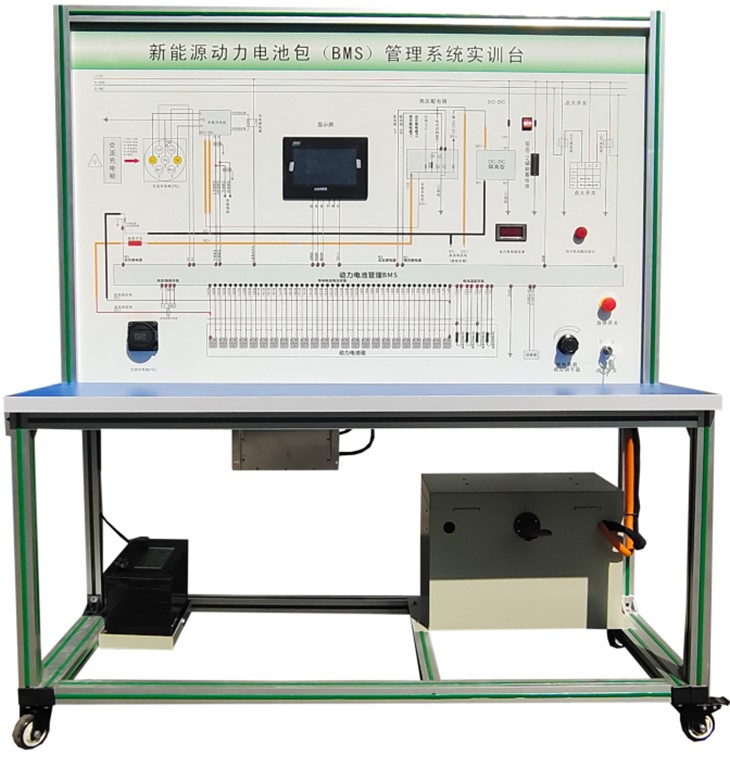 磷酸鐵鋰動(dòng)力電池包與鐵制電池箱(單體電池3.2V 20AH,24串)、BMS鋰電管理一體機(jī)、動(dòng)力電池包觸摸顯示屏、車載充電機(jī)、國(guó)標(biāo)充電插口、國(guó)標(biāo)充電槍、緊急斷電開(kāi)關(guān)、霍爾電流傳感器、直流接觸器(包含充電繼電器、總正繼電器、總負(fù)繼電器、預(yù)充繼電器)、DC-DC轉(zhuǎn)換器(72V-12V30A)、輔助蓄電池(12V45AH)、放電控制繼電器與放電負(fù)載電阻、預(yù)充電阻器、可移動(dòng)實(shí)訓(xùn)臺(tái)(1500×700×1700mm 帶自鎖腳輪裝置,帶安裝檢測(cè)端子的原理面板,面板1448×940mm)、故障模擬與排除裝置、設(shè)備操作說(shuō)明書(shū)。