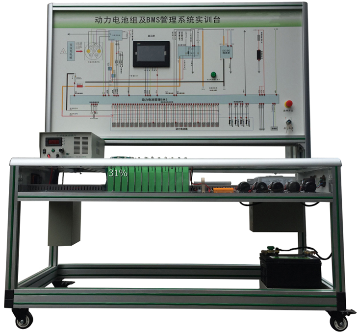 磷酸鐵鋰動力電池包與鐵制電池箱(單體電池3.2V 20AH,24串)、BMS鋰電管理一體機、動力電池包觸摸顯示屏、車載充電機、國標充電插口、國標充電槍、緊急斷電開關(guān)、霍爾電流傳感器、直流接觸器(包含充電繼電器、總正繼電器、總負繼電器、預(yù)充繼電器)、DC-DC轉(zhuǎn)換器(72V-12V30A)、輔助蓄電池(12V45AH)、放電控制繼電器與放電負載電阻、預(yù)充電阻器、可移動實訓(xùn)臺(1500×700×1700mm 帶自鎖腳輪裝置,帶安裝檢測端子的原理面板,面板1448×940mm)、故障模擬與排除裝置、設(shè)備操作說明書。