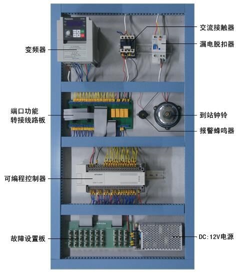 電梯的電氣控制系統(tǒng)采用PLC和交流變頻調(diào)速控制,其硬件結(jié)構(gòu)的組成及功能與實際電梯完全一樣。具有自動平層、自動關(guān)門、順向響應轎內(nèi)外呼梯信號、直駛、電梯安全運行保護以及電梯急停、慢上、慢下、照明、風扇等功能,性能可靠、運行平穩(wěn)、操作簡單、能耗低,特別適合于教學。此外,透明仿真教學電梯的軟硬件均采用開放式結(jié)構(gòu),因此,院校也可以利用此套裝置進行二次開發(fā)研究。